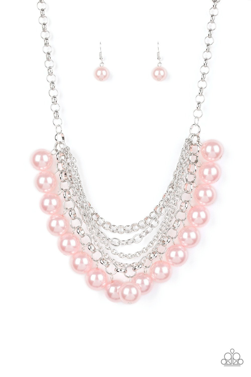 A collision of mismatched silver chains layer below the collar. Over sized pink pearls dangle from the lowermost chain, creating a dramatically refined fringe for a statement-making finish. Features an adjustable clasp closure. Goes perfectly with "Girls in Pearls"