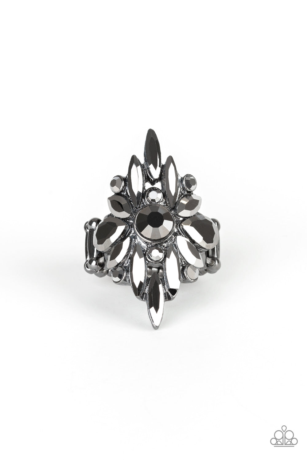 Varying in shape and size, a collision of glittery hematite rhinestones or glassy pink rhinestones burst across the finger, coalescing into a blinding frame. Features a stretchy band for a flexible fit.