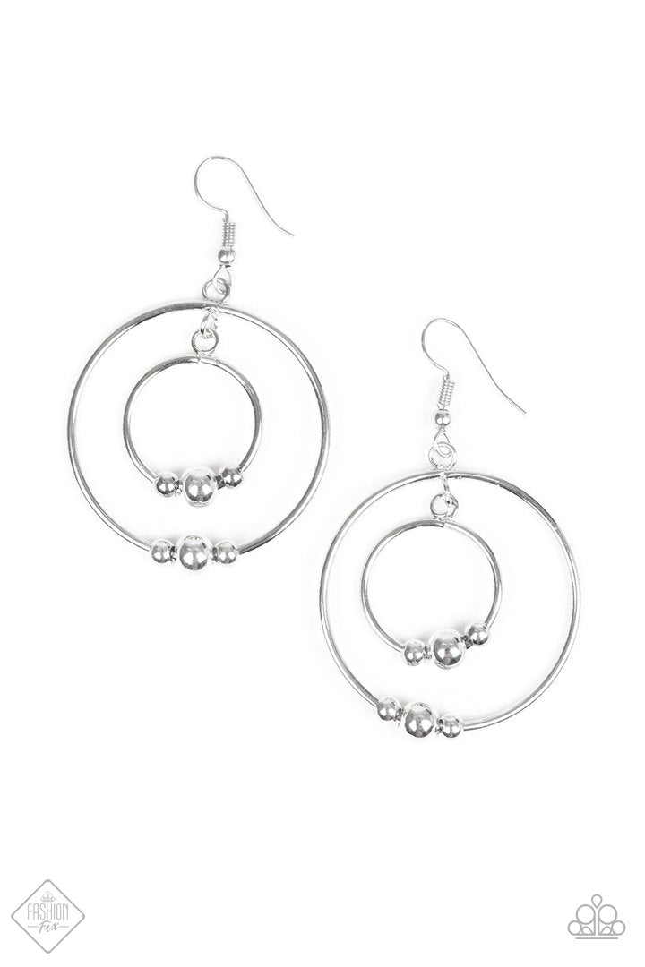 Varying in size, dainty silver beads slide along the bottoms of shimmery silver