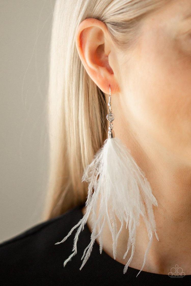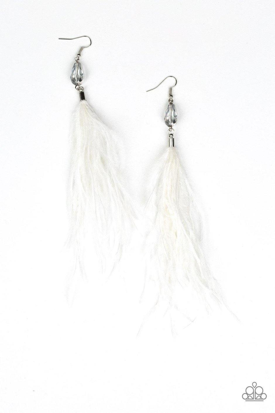 A plume of white feathers flare out from the bottom of a faceted hematite bead, creating a glamorous tassel. Earring attaches to a standard fishhook fitting.