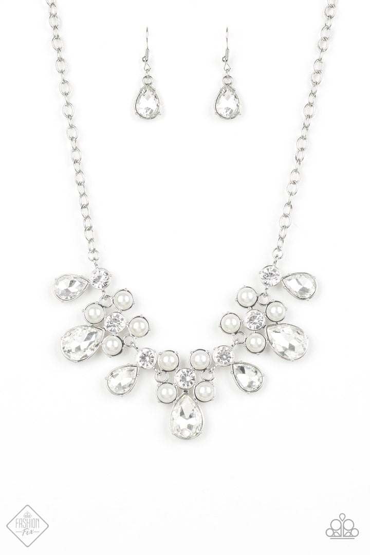 A sparkling collection of classic round and dramatic teardrop-shaped rhinestones fan out along the collar in a dazzling display. Timeless white pearls are sprinkled along the clusters of rhinestones, adding a beautiful refinement to the design. Features an adjustable clasp closure.