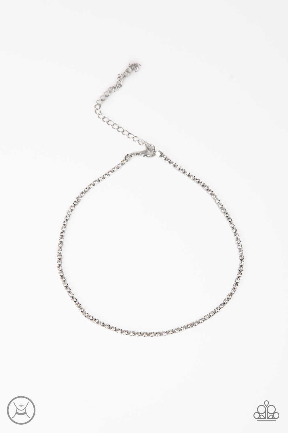 Pressed into sleek silver square frames, a strand of glittery white rhinestones wraps around the neck for an edgy look Features an adjustable clasp closure.