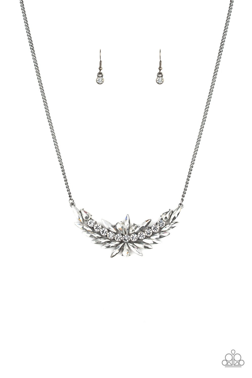 Featuring round, marquise, and teardrop style cuts, a glassy collection of glittery white rhinestones coalesce into a blinding pendant below the collar. Features an adjustable clasp closure.
