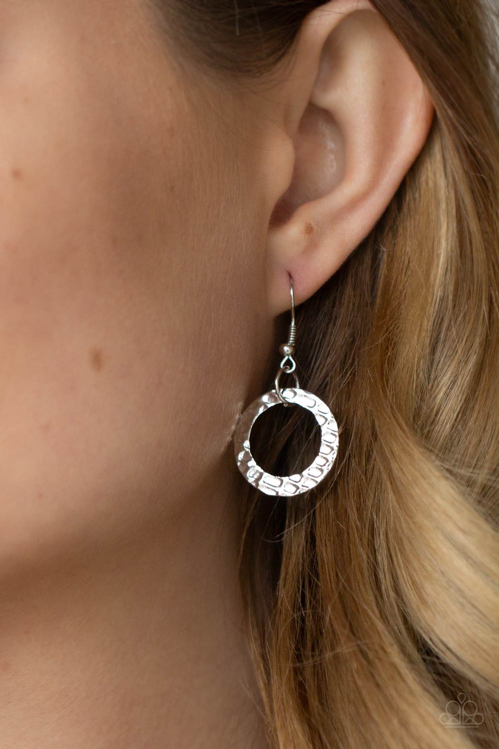 A hammered collection of silver discs, silver rings, and sections of chunky silver chain boldly link across the chest for an intense industrial style. Features an adjustable clasp closure.