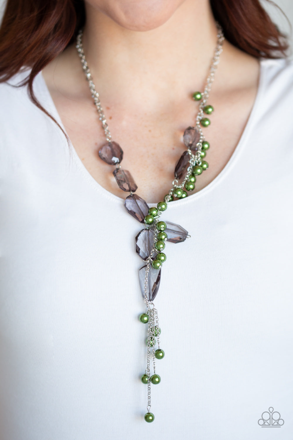 Featuring an array of shapes and cuts, a collection of faceted smoky gems link below the collar for a glamorous shimmer. A shimmery silver strand of pearly blue/red/green beads trickles down one side of the piece, creating a flirtatious extended pendant. Features an adjustable clasp closure.