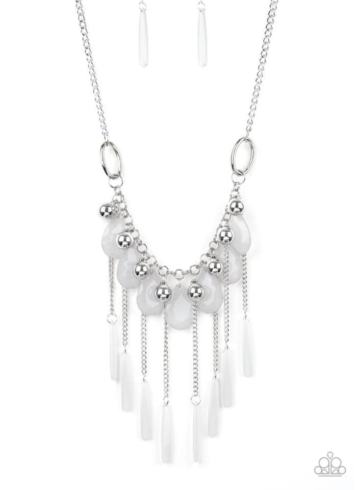 Shiny silver beads and faceted cloudy teardrops drip from the bottom of a shimmery silver chain below the collar. Flared cloudy beading swings from the bottoms of free-falling silver chains, creating a vivacious fringe. Features an adjustable clasp closure.