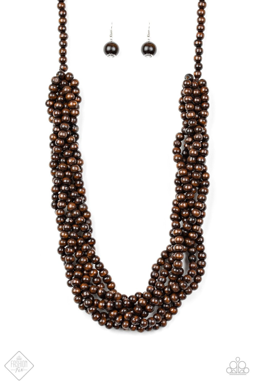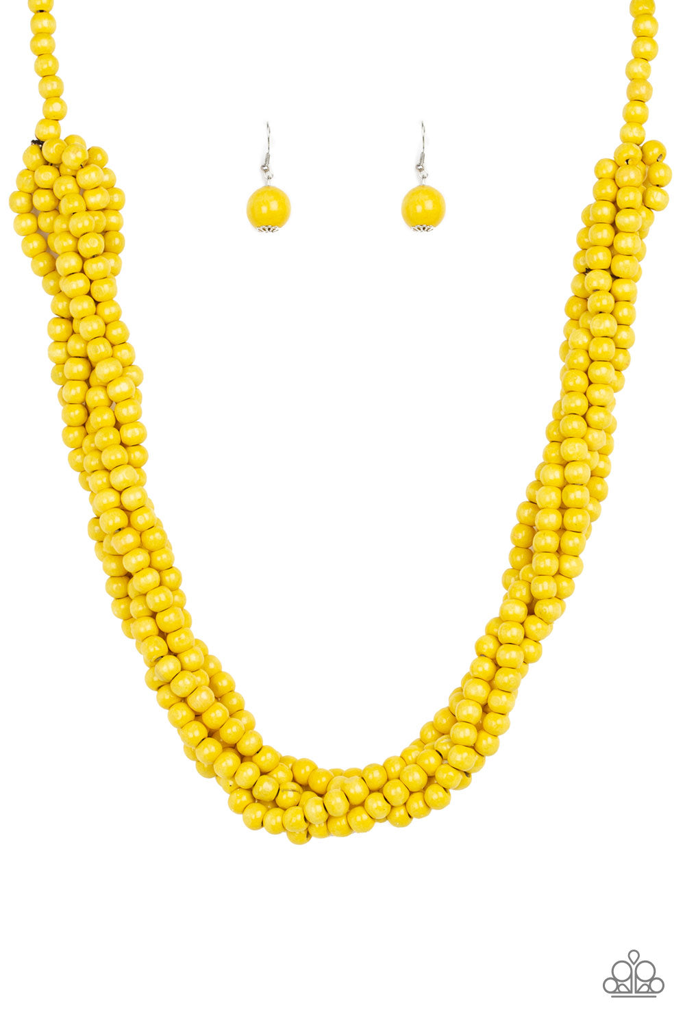Brushed in a bright colored finish, strands of vivacious wooden beads subtly twist across the chest for a summery look.