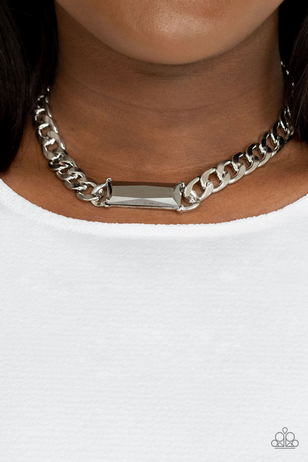 A dramatically oversized row of silver chain attaches to an emerald cut hematite rhinestone pendant, creating a demanding centerpiece below the collar. Features an adjustable clasp closure.