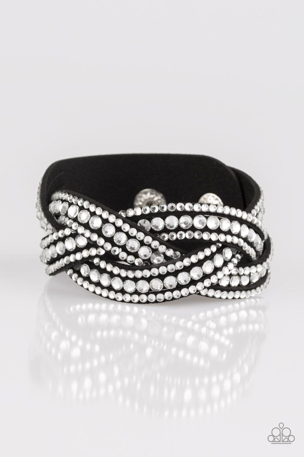 Varying in size, glassy white rhinestones are encrusted along interwoven black or orange suede bands, creating blinding shimmer across the wrist. Features an adjustable snap closure.