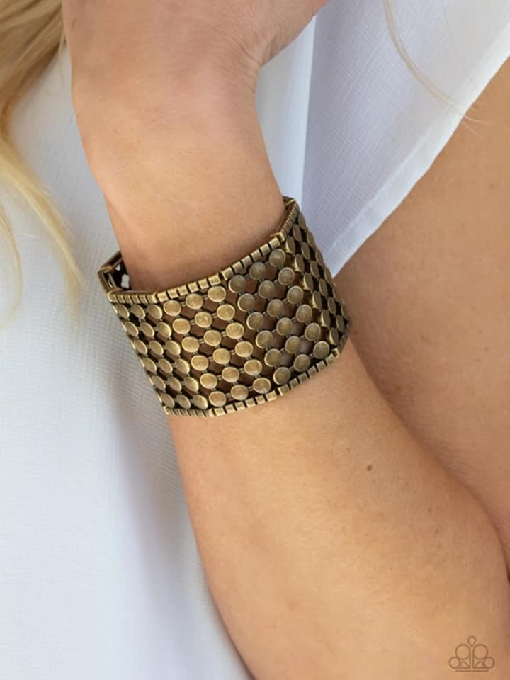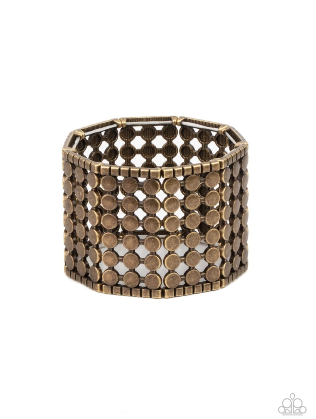 Bordered by rows of silver cubes, stacked rows of antiqued silver dots connect into rectangular frames that are threaded along stretchy bands around the wrist for an edgy geometric finish.