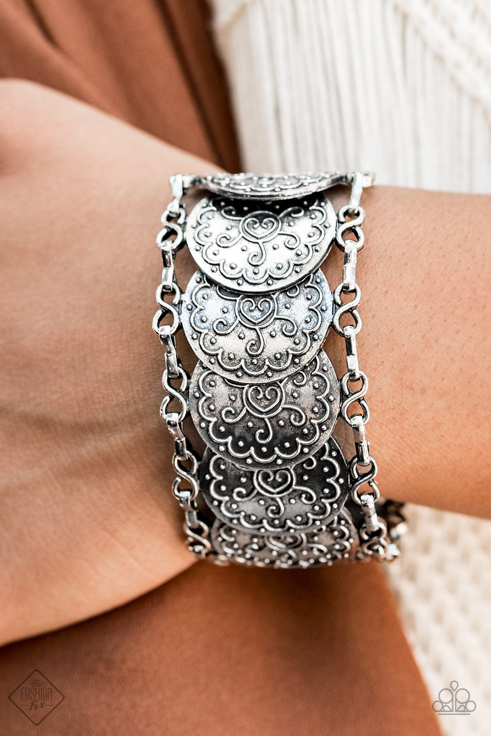 Embossed in antiqued floral patterns, overlapping silver discs link with ornate silver chains around the wrist for a one-of-a-kind look. Features an adjustable clasp closure.