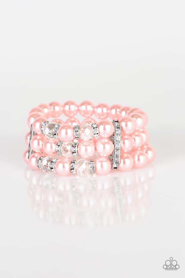 Pinched between white rhinestone encrusted frames, white rhinestone encrusted rings, crystal-beads, and colored pearls are threaded along elastic stretchy bands for a glamorous look.