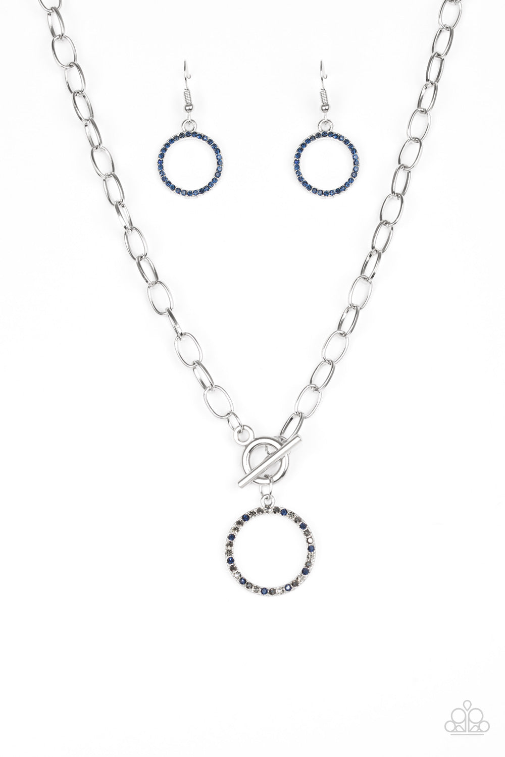 Encrusted in glittery blue, smoky, and hematite rhinestones, a bubbly silver pendant swings below the collar for a colorfully casual look. Features a toggle closure.